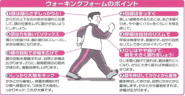 ジョギングと異なり、常に足が地面についていますので、膝や腰の疾患を抱えている方でも傷害のリスクが少なく、精神面でも開始時のハードルが低い運動として人気があります。