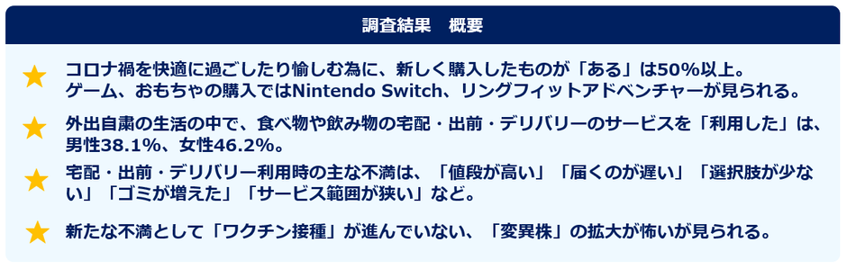 ・コロナ禍を快適に過ごしたり、愉しむ為に、新しく購入したものを確認すると、家族や友人・知人と遊ぶためのゲームや、おもちゃが多く見られました。NintendoSwitch、リングフィットアドベンチャー、ゲームソフト、ゲーム機など、子供と一緒に遊ぶ目的で購入した人も多いと考えられます。