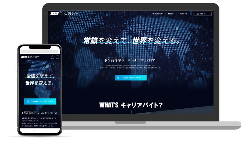 今回、N高生専用の長期インターンシップ情報サイト『N高キャリアバイト』を開設することで、N高生が実際の就業に即した実践的なスキルを身につけられる機会を創出します。N高での授業で得た知識をインターンシップで実践することで、学業とのシナジーを生み出し、N高生の能力・技術の向上並びに就業観・労働観の形成と確立を目指してまいります。