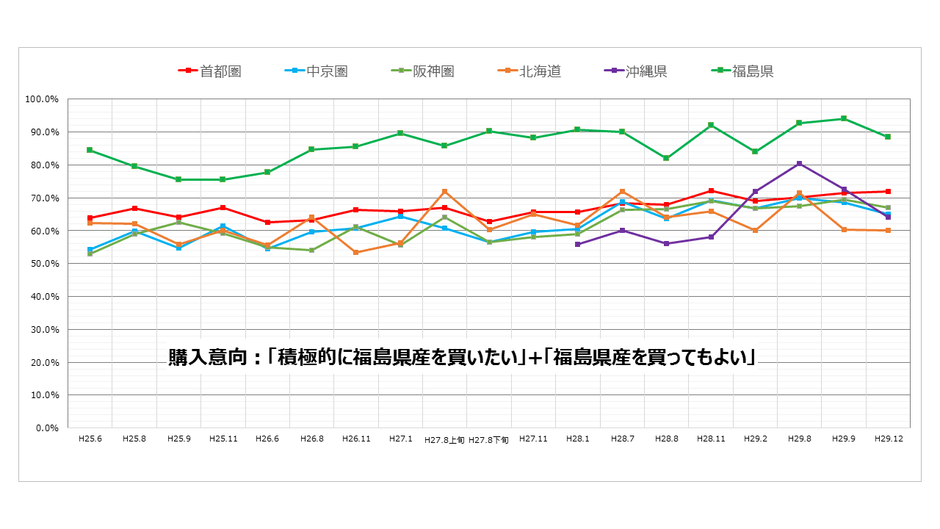 福島県産の農産物についての購入意向を、首都圏、中京圏、阪神圏、北海道、沖縄県、福島県にて調査。