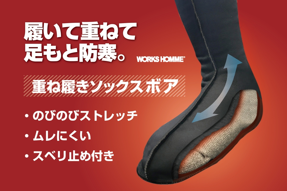 冬の屋外での作業、特に鉄製の先芯が入った安全靴を履くような現場作業では、先芯から冷たさが伝わり、凍るような冷たさを感じることも。そんな時に活躍するのが「重ね履きソックス ボア」。その名の通り裏地がボア仕様になっているので暖かく、ストレッチ素材で脱ぎ履きしやすく、さらに適度に通気性があるので、ムレも抑えてくれ履き心地は快適!