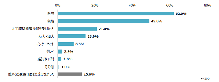 人工膝関節置換術を受けた患者が影響を受けた人は、62.0%が「医師」、次いで「家族」(49.0%)が多かった。人工膝関節置換術を受けていない患者は、「他からの影響を受けない」と答えた患者が26.5%と、人工膝関節置換術を受けた患者の13.0%に比べて多かった。