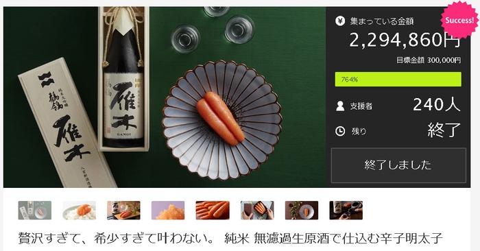 株式会社島本食品(本社:福岡県糟屋郡 、代表取締役:波多江 正剛、以下 島本)は、クラウドファンディングサイト「Makuake(マクアケ)」にて、『純米 無濾過生原酒で仕込む辛子明太子』のプロジェクトを2019年5月30日(木)より開始し、掲載30分で目標金額を達成、終了日までに目標金額の764%達成という多くのご支援をいただきました。