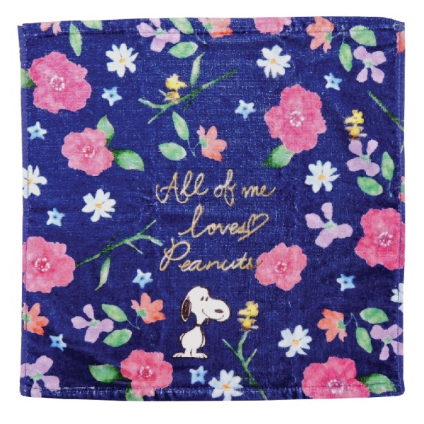 鮮やかな花柄が好みなら、大人っぽいネイビーに多彩な花たちがよく映えるこちらのハンドタオルが素敵ですよ♪微笑むスヌーピーとウッドストックに癒されます。