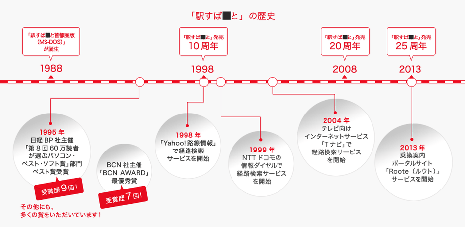 1988年に「駅すぱ■と首都圏版(MS-DOS)」が誕生して以来、経路検索システムのパイオニアとして業界を牽引してきた「駅すぱ■と」。現在に至るまで 「いつでもどこでも誰にでも」をコンセプトに日々進化を続けています。