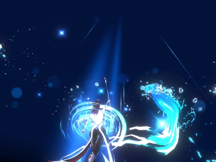 通常攻撃を強化するスキル「対魔殺法:流水」を装備すると、通常攻撃の最後に水遁の武器を召喚、さらに広範囲の敵に追撃を与えることができる。