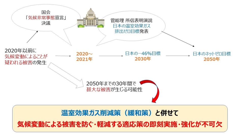 歴史的に多くの温室効果ガスを排出しながら発展してきた先進国の一員として、特に災害が多く、仙台防災枠組等、世界の防災・減災取組をリードしてきた日本の果たしうる役割は大きいと考えられます。
