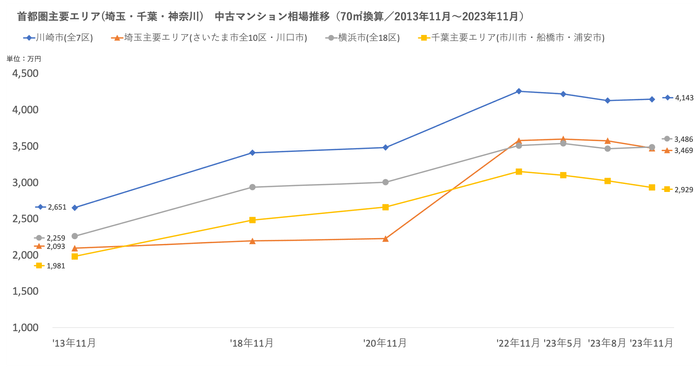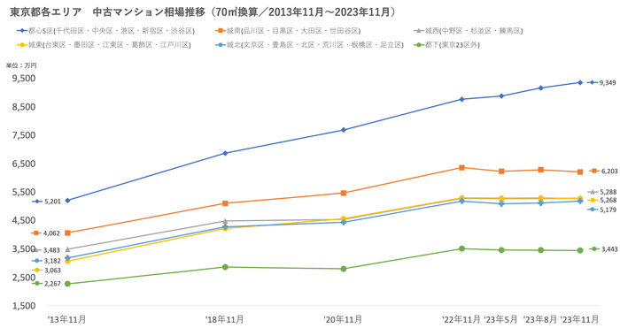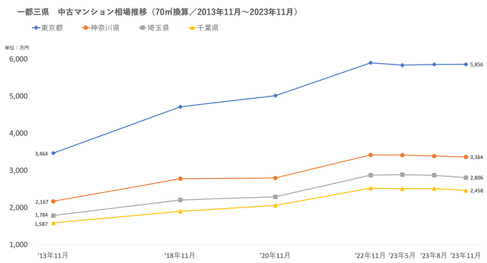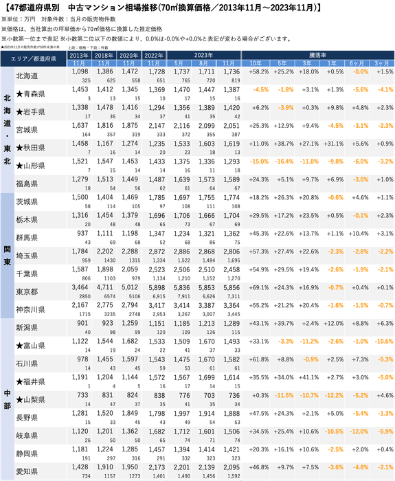 「不動産×WEB×ビッグデータ」の領域で、さまざまな不動産テックサービスを展開する株式会社ワンノブアカインド(本社:東京都港区、代表取締役社長:川島 直也、以下当社)は、当社が運営しているマンション情報サイト「マンションレビュー」の保有データを元に、全国の2023年11月の中古マンション相場を調査。坪単価をベースに70㎡での価格に換算した「中古マンション価格」*1について、10年前・5年前・3年前・前年からの推移を都道府県別・エリアごとにまとめましたので、発表いたします。