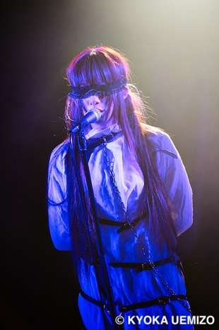 ライブ冒頭、SEが鳴り響くと同時にギタリスト・佐藤カズキ(SCRAMBLES)が登場。普段とは違うライブ編成での演奏に会場の期待感はさらに高まると、次に登場したのは全身を拘束で目隠しをされた椎名ひかり。ライブの幕開けとなった新曲「hate!hate!hate!」(作詞:椎名ひかり/作曲:PABLO)では、先日公開されたミュージックビデオになぞらえた奇怪な演出・寸劇で、「椎名ひかり」としての新たなパフォーマンスを展開しました。