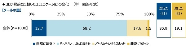 全回答者(1,000名)に、コロナ禍前と比べてメールの量が増えたか、減ったか聞いたところ、「非常に増えた」が12.7%、「どちらかといえば増えた」が68.2%で、合計した『増えた(計)』は80.9%、「非常に減った」が1.5%、「どちらかといえば減った」が17.6%で、合計した『減った(計)』は19.1%となりました。コロナ禍前よりメール量が増えたという人が大多数のようです。