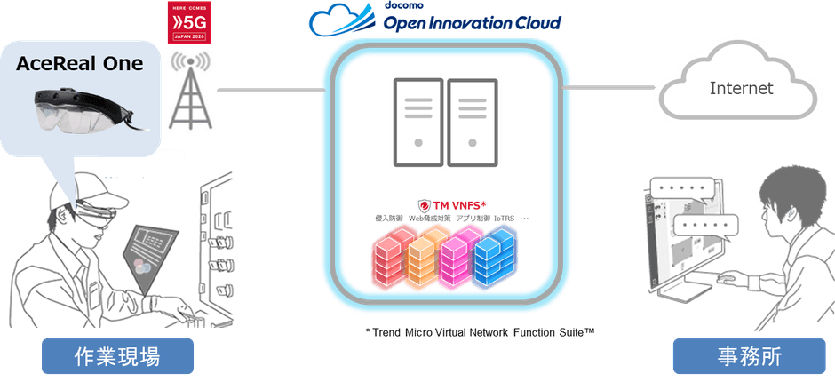 サン電子様が提供するクラウド型業務支援アプリケーション「AceReal Apps」とトレンドマイクロが提供する「Trend Micro Virtual Network Function Suite」がドコモオープンイノベーションクラウドで協創することで、「AceReal Apps」やARスマートグラス「AceReal One」に対する外部からの不正な操作や脆弱性を突いた攻撃を防ぐことができます。