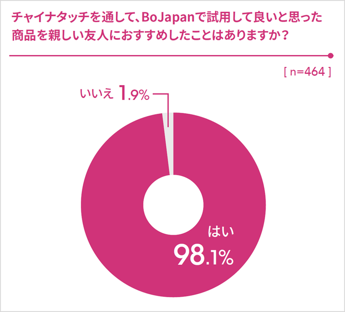 チャイナタッチ(※)のキャンペーンや座談会を通して試用し良いと思った商品は、98.1%の方が「親しい友人におすすめしたことがある」と回答しています。中国人は良いと思ったものは積極的に自分から発信し、その情報がクチコミとなり、さらにSNS上や前述した個別での相談によって拡散されます。98.1%というこのクチコミ生成率の高さは、「中国人がいかに情報発信に積極的であるか」を明らかにする結果となりました。