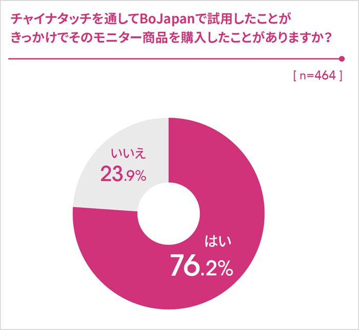 チャイナタッチ(※)のキャンペーンや座談会を通して試用した商品を、その試用体験がきっかけで「購入したことがある」と回答した人は全体の76.2%でした。自身で体験し、十分にその価値を理解し納得できれば購入が発生しやすいという中国人の傾向が、「4人に3人が購入経験がある」という高い数値からも読み取れます。