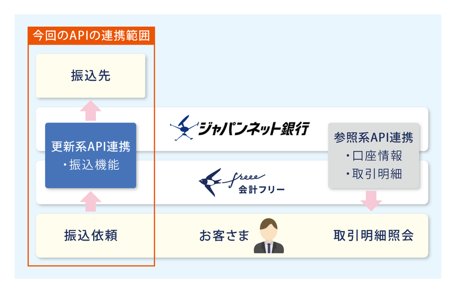 ※1: 銀行の口座情報を外部連携するAPI には、更新系APIと参照系APIの2種類あります。更新系APIは外部サービス内から振込に係る情報連携を実現するAPIであり、参照系APIは金融機関の入出明細や残高情報等を外部サービスに情報連携するAPIです。