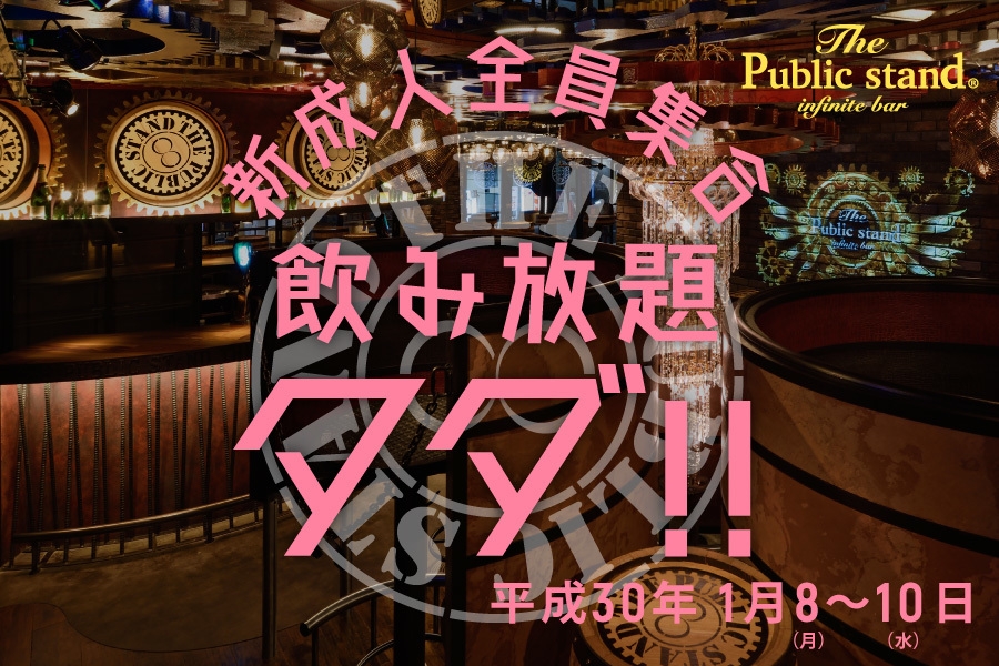 株式会社セクションエイト(所在地:東京都品川区、代表取締役社長:横山 淳司)が運営する、時間無制限飲み放題、出入り・店舗間往き来自由(※)のスタンディングバー「The Public stand」は、2018年「始まり」をテーマに新成人を応援。キャンペーン内容として、2018年1月8日から2018年1月10日までの3日間、2018年新成人に対して、無制限飲み放題を無料にて御招待します。