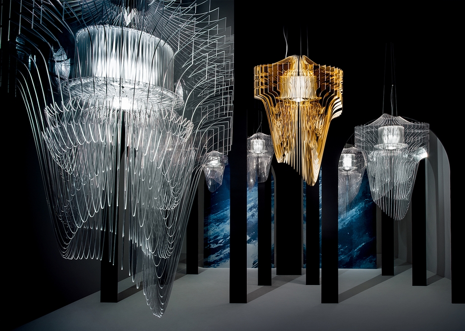 そして彼女の研ぎ澄まされた動的感覚によるインスピレーションを実現したのが、発売元であるイタリアの照明ブランドSLAMP(スランプ)です。ARIAを形成する一枚一枚形の異なる50枚の羽は、SLAMPが独自に開発した樹脂素材「クリスタルフレックス」によるもの。SLAMPは光の反射や質感にこだわった革新的な独自の素材で、建築家やクリエイターとタッグを組んで新しい照明を生み出しています。