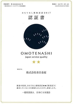 株式会社杢目金屋は、江戸時代から続く伝統工芸技術「木目金(もくめがね)」をブライダルジュエリーという形で現代に蘇らせ、世界中から注目されており、 2018年2月に経済産業省創設 「おもてなし規格認証」において「期待を大きく超えるおもてなし提供者」である事業所に付与される最高位の「★★★(紫認証)」を取得しています。