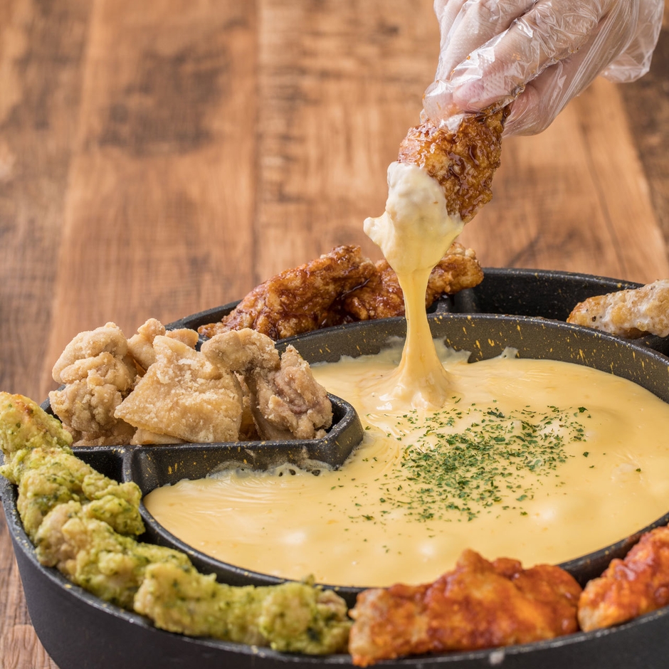 まるでUFOのような円形のプレートにたっぷりのチーズとフライドチキンが盛り付けられた新感覚のチーズグルメ!旨辛ヤンニョムチキンとプレーンの2種類のチキンを、当店オリジナルのチーズソースに絡めてお召し上がりください。
