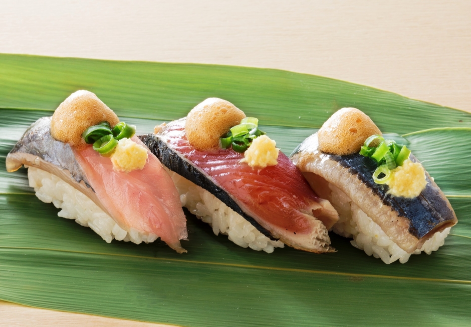 ★鯵・藁焼きかつお・秋刀魚の寿司を1貫づつ味わう「秋魚3貫王」。