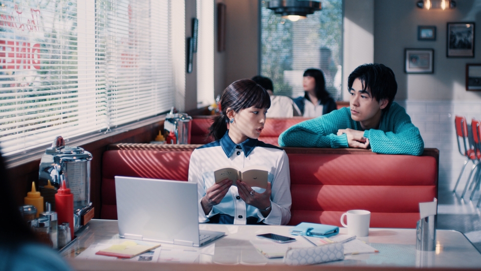 今回の『NONIO プラスホワイトニング』のCMの舞台は、ダイナー調のおしゃれなカフェ。スタジオに用意されたカフェのセットで、撮影は始まりました。今回のCMで初共演となる川口さんと成田さんは、初めこそ緊張の様子でしたが、カメラが回っていない時間にもおしゃべりをするほど打ち解けていき、本番では自然な様子で微笑み合うカットがたくさん撮影できました。