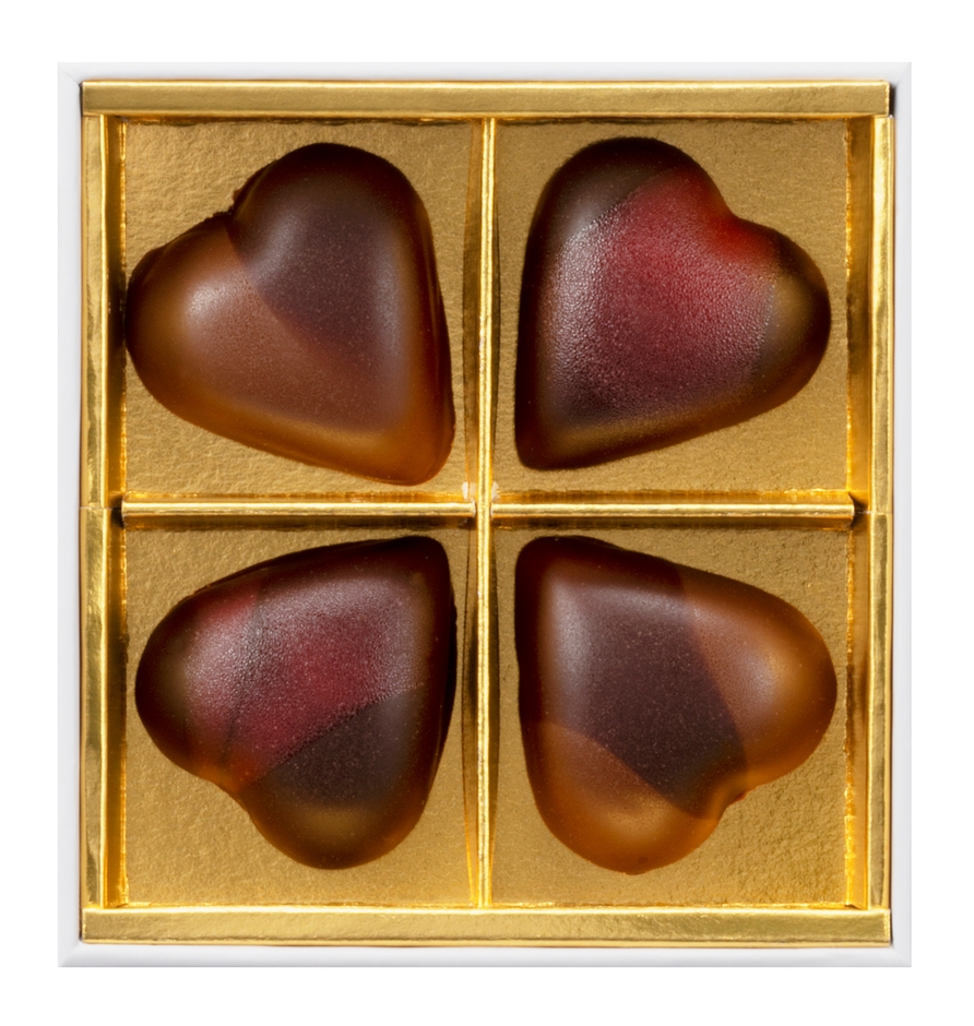 こだわって創ったプラリネと、口とけの良いガナッシュ。本格ショコラをかわいらしいハートのかたちに。幸せの四つ葉のクローバーをイメージしてパッケージング。ヘーゼルナッツの香ばしいプラリネにミルクチョコレートをコーティング<クール・ノワゼット>、ほのかにラズベリーが香るガナッシュにダークチョコレートをコーティング<クール・フランボワーズ>