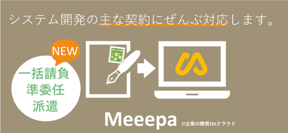 TDCソフト株式会社(東京都渋谷区、代表取締役社長:小林 裕嘉、以下 当社)は、2019年10月24日にIT企業向けクラウドEDIサービス『Meeepa』(以下 当サービス)の新機能をリリースしました。当サービスはこれまでパートナー企業との準委任契約と派遣契約に対応しておりましたが、この度「一括請負」の契約形態にも対応しました。