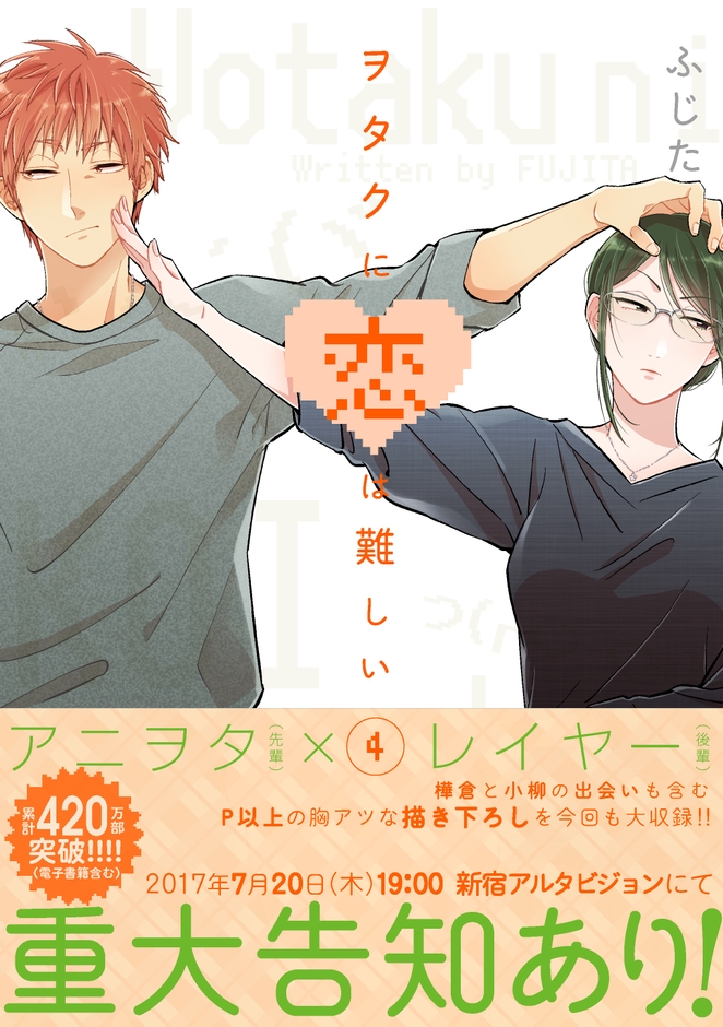 株式会社一迅社(所在地:東京都新宿区、代表取締役会長:原田 修)は、マンガ・イラスト大手投稿サイト「pixiv」( http://www.pixiv.net/ )と提携する電子書籍サービス『comic POOL』(コミックプール)よりシリーズ累計420万部を超える(2017年7月26日の4巻出版時点)大人気コミック作品(下記:実績1)『ヲタクに恋は難しい』 4巻(著:ふじた)発売記念の宣伝企画「豪華声優陣による発売告知ロングPV( https://youtu.be/mcwJtII8mnw )」の中でコミックス新刊表紙の公開と7月20日(木)に新宿アルタビジョンにて“重大告知を行う”事を発表いたします。