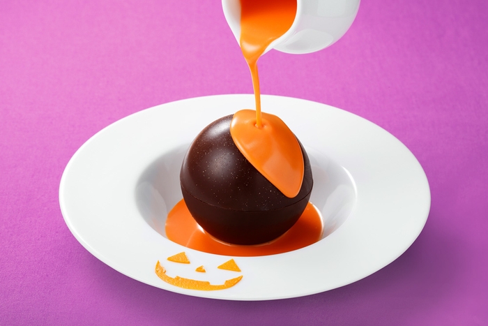 パンプキンの甘い香りと、鮮やかなオレンジ色をアクセントにしたハロウィン仕様のメルティムーンチョコレート。あつあつのパンプキンソースをかけると、中からマスカルポーネムースやパンプキンアイスクリーム、ほろほろ甘いシュトロイゼルが現れます。チョコレートがとろける瞬間のムービー映えも抜群です!