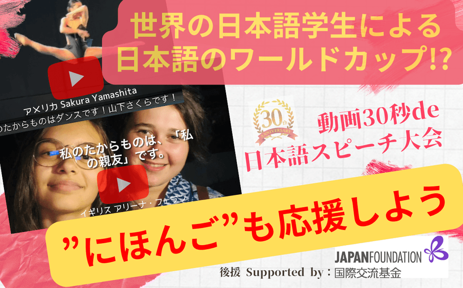 世界の日本語学生による≪動画30秒de日本語スピーチ大会/後援:国際交流基金≫の本選・授賞式が11月26日に開催されます。テーマは「わたしのたからもの」。友だち、我が家、過ぎ去りし時間。「いいね!」と思う作品に「アナタ賞」を贈呈してあげてください。その賞は受賞者にとって一生の宝物になることでしょう。海外の日本語学生たちのワールドカップで、“にほんご”も応援しよう!