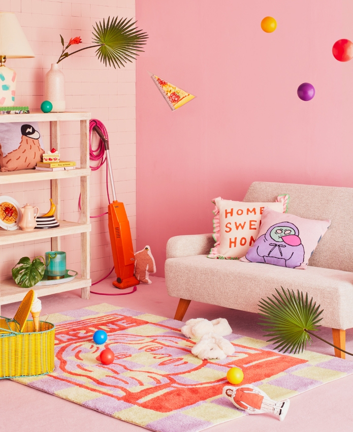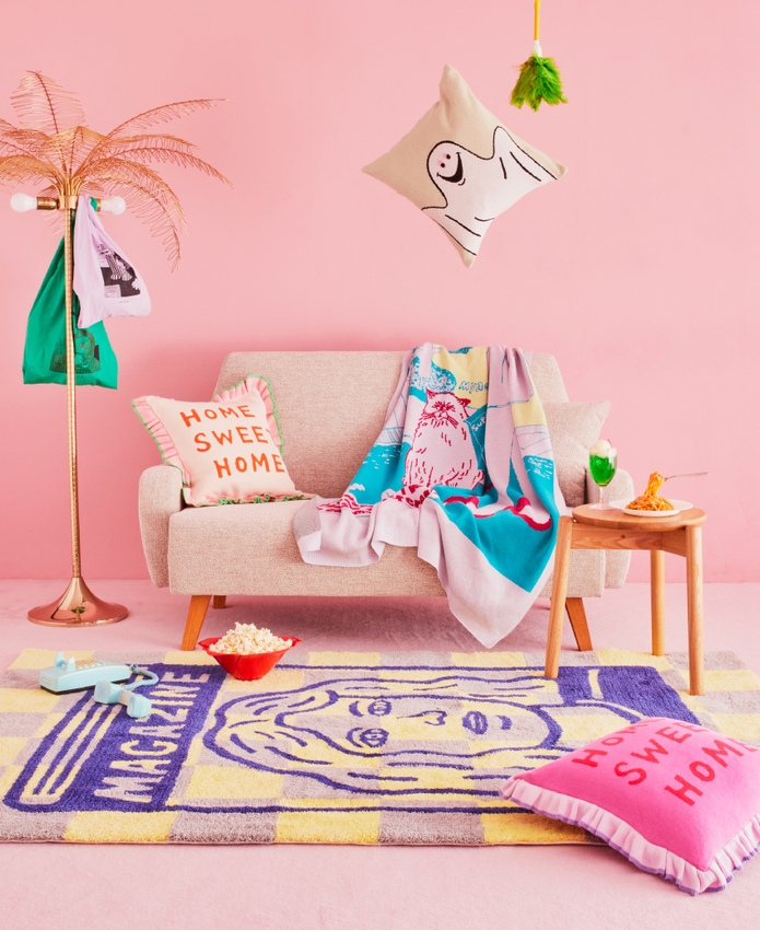 手描きのラフな雰囲気を活かしたニット素材のクッションや、毛足がフサフサとした犬のバブーシュなど、アイテムに合わせた様々な素材で程よいゆるさを表現しています。