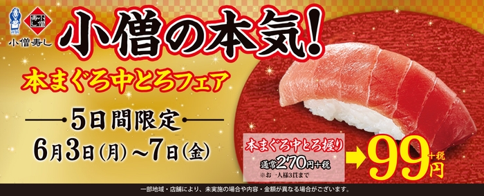 株式会社小僧寿し(東京都中央区、代表取締役・小林剛)は、6/3(月)~6/7(金)の5日間、小僧の本気!本まぐろ中とろフェアを開催致します。
