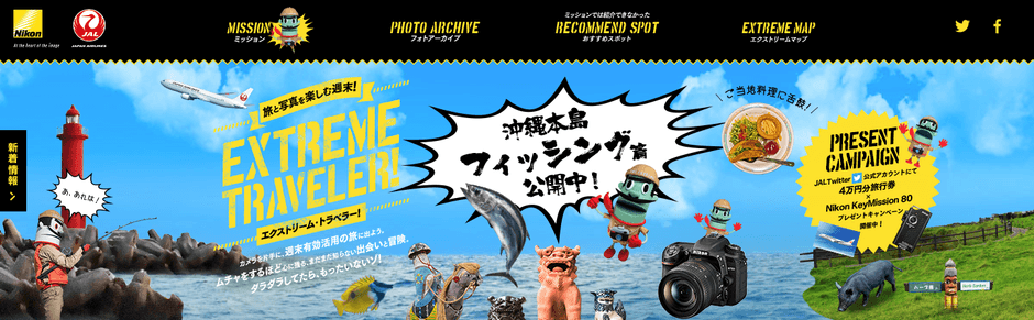 「EXTREME TRAVELER!」は、「旅と写真を楽しむ週末!カメラを片手に、週末に有効活用の旅に出よう。」をコンセプトにした、ニコンイメージングジャパンとJALのコラボレーション「タビトイロ」、「タビビトレンズ」に続く第3弾のウェブサイトです。まだまだ知らない出会いと冒険を求めて、“エクストリーム”な旅と写真を楽しむ週末をナビゲートします。