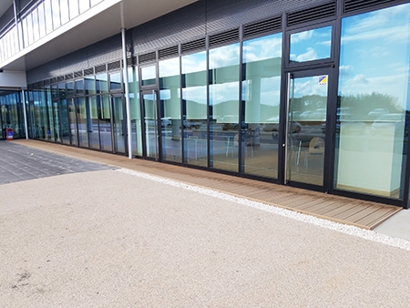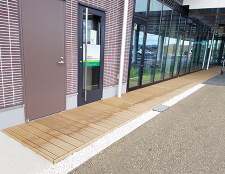 現場を担当した大手ゼネコン様の図面には、玄関前に人工木のデッキ材を敷く予定になっていましたが、商品選定までは確定していなかったので、弊社の再生木材エス・ウッドをご提案させていただく運びとなったのでした。