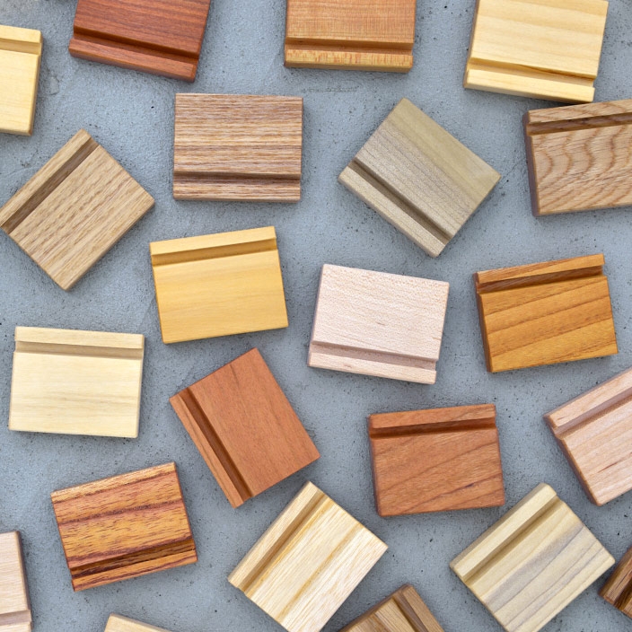 建築や高級家具製作時に発生する端材を再利用。木材の種類がサクラ、メープル、ケヤキ、イチョウ、オークなど多種に渡るため、ランダムで封入します。
