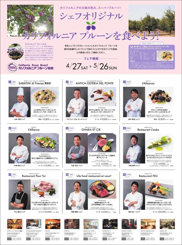 カリフォルニア プルーン協会(本部:カリフォルニア州ローズビル)は、4月27日から5月26日の一ヵ月間、都内有名レストラン9店舗でシェフオリジナル、カリフォルニアプルーンメニューフェアを開催します。