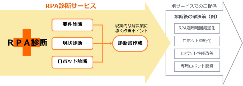 本サービスは、RPAを導入したものの期待していた効果を得られていない企業に対し、効果を最大限に発揮させるための解決方法を“診断書”として提供をいたします。