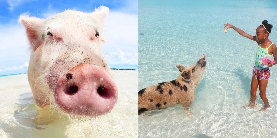 バハマの首都ナッソーから飛行機で約30分、300以上もの小さな島からなるエグズーマ諸島。その中にある無人島「ビッグ・メジャー・ケイ」は通称「ピッグ・ビーチ(ブタさんビーチ)」とも呼ばれ、野生化した豚たちがのどかに暮らしています。