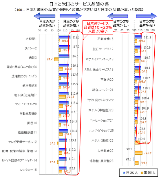 1.日本のサービス品質は、宅配便や地下鉄、コンビニエンスストアなど今回対象とした28のサービス分野のほとんどで米国を上回る。
