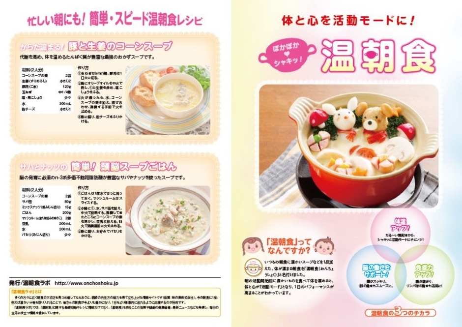 2014年9月の発足以降、朝食に温かいものを摂取することの重要性を啓発、情報発信している団体『温朝食ラボ』(事務局:東京都渋谷区)は、1都3県(神奈川県、埼玉県、千葉県)の小学校100校を対象に、“温朝食”の魅力をお伝えするリーフレットを配布しております。
