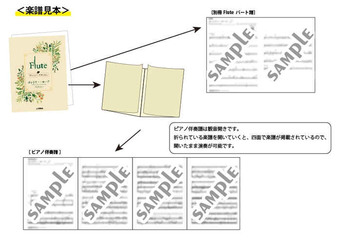 楽譜はソロ用パート譜とピアノ伴奏譜に分かれていて、ピアノ伴奏譜は菊倍縦4面の観音開きなので、譜めくりの必要がなく演奏に集中できます(一部譜めくりが必要な曲もございます)。