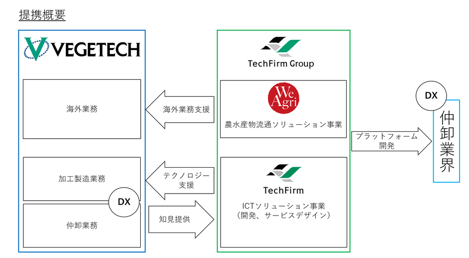 テックファームグループで農水産物流通ソリューションを手掛ける株式会社We Agri(東京都中央区、代表取締役 岩藤健二、以下:We Agri)は、青果仲卸最大手の株式会社ベジテック(神奈川県川崎市、代表取締役社長 遠矢康太郎、以下:ベジテック)と業務提携を締結しました。本提携によりWe Agriがベジテックの海外業務を支援するとともに、テックファームグループによるテクノロジー支援でベジテックのデジタル革新(DX)を進めます。またテックファームグループは、その知見を活用して仲卸各社をつなぐプラットフォームを開発し、業界全体のDXを目指します。得られたデータを分析することにより潜在的な課題や商機を発見し、業界の持続的成長に貢献します。