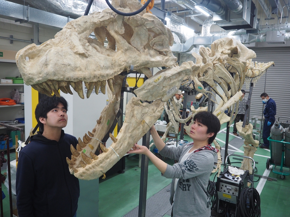 岡山理科大 タルボサウルスの全身骨格組み上げ/3月2日の公開に向け、追い込み作業/全長10メートル・高さ2.7メートル