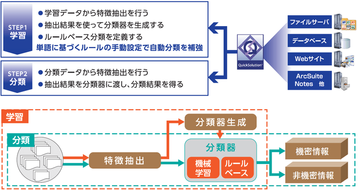 今回、QuickSolutionに、AI技術のひとつである機械学習(教師あり学習)によるテキスト分類技術を応用した、文書の自動分類機能を新しく搭載しました。事前に学習データを与えることにより、分析対象をいくつかの分類に仕分けることができます。その際、学習データや分析対象として、QuickSolutionで取り扱う多彩な検索対象(ファイルサーバ、Webサイト、Notes、データベース、Office 365など)の情報を利用可能です。また、機械学習による分類に加えて、特定のルール(指定キーワードを含むなど)による分類を併用することもできます。これにより、管理者の狙い通りに仕分けやすくなります。