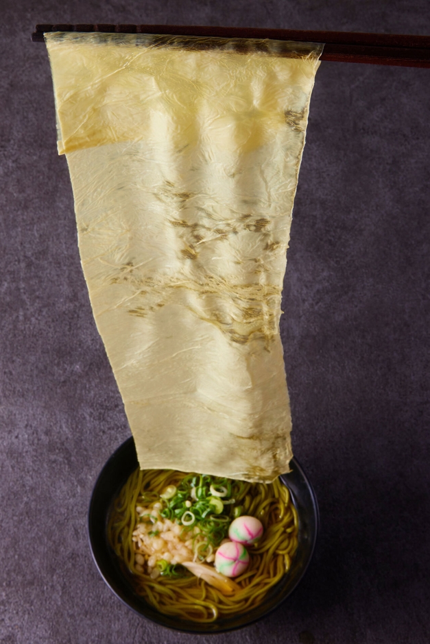 宇治抹茶そばに、新作『大判湯葉そば』が登場いたします。温めた豆乳の上に柔らかく張った湯葉を竹串で引き上げる伝統的な製法で手作りした、しっとり大きな引き上げ湯葉を使用。引き上げ湯葉の独特な歯ごたえと濃厚な味わいが楽しめます。