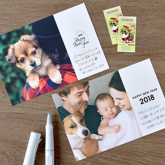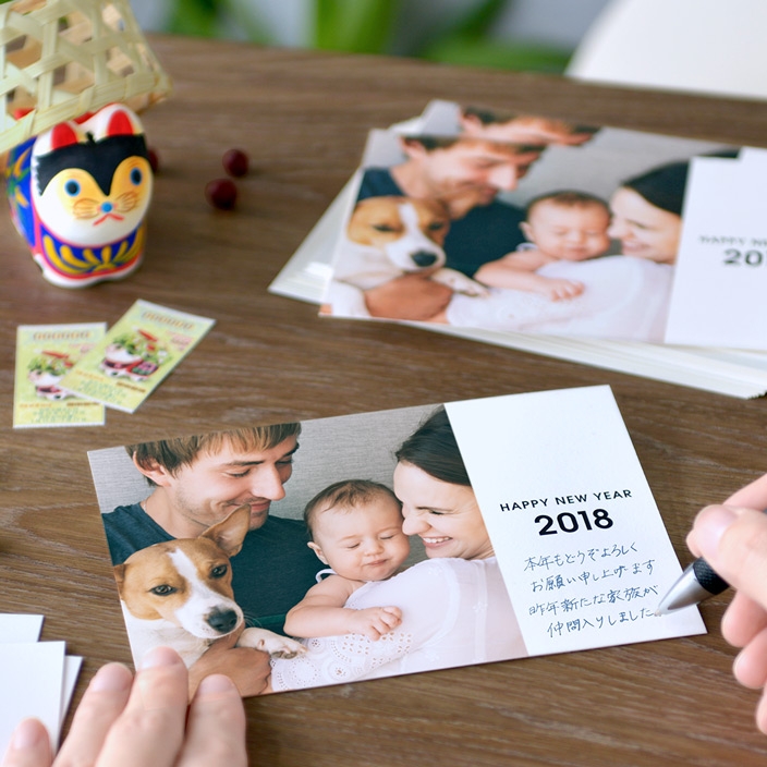 写真1枚の同一柄が1セット30枚で500円(税込み・送料無料)。年賀状印刷サービスでは一般的な基本料金がTOLOTでは必要ありません。ただし、私製のポストカードのため、別途切手は必要になります。お年玉くじ付きの年賀郵便切手を使用した場合、切手代が55円×30枚=1,650円掛かるとしても、合計2,150円。写真が入った30枚の年賀状が切手代込みで1枚あたり約72円は、他社と比較しても安価に作れます。