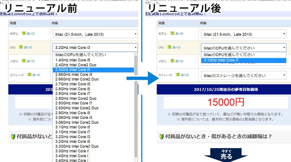 あなたのiMacのモデル、CPU、メモリ、ストレージを選択するだけで、iMacの参考買取価格がスグわかります。更に、今回のリニューアルでは、選んだモデルに応じて自動的に対応しているCPUのみ表示されるようになりました。