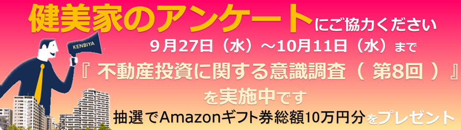 不動産投資と収益物件の情報サイト「健美家(けんびや)」を運営する健美家株式会社(本社:東京都港区、代表取締役社長:倉内敬一)では、9月27日(水)~10月11日(水)まで、健美家会員を対象とした「不動産投資に関する意識調査(第8回)」のアンケート調査を実施いたします。