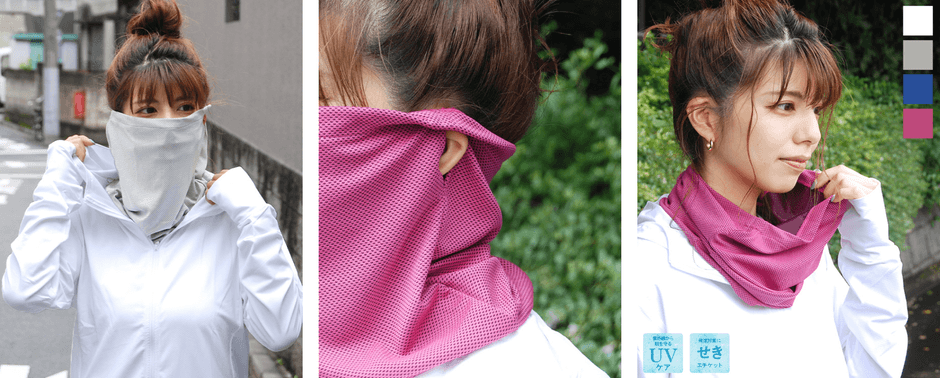生地丈があり首元までしっかりカバーされますので、飛沫対策はもちろん、真夏の炎天下での日焼け・UVケア対策としてもおすすめです。