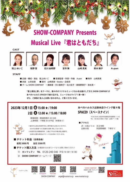 SHOW-COMPANY(代表:阪上めいこ)主催、「Musical Live『君はともだち』」が2023年12月1日 (金) ~2023年12月2日 (土)にSPACE9(大阪府大阪市阿倍野区阿倍野筋1-1-43あべのハルカス近鉄本店ウイング館9階)にて上演されます。