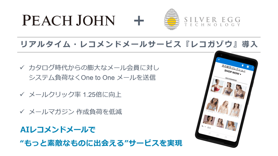 シルバーエッグ・テクノロジー株式会社(本社:大阪府吹田市、代表取締役社長&CEO:トーマス・フォーリー、東証マザーズ:3961、以下 シルバーエッグ社)は、同社が開発・提供するAI技術を用いたリアルタイム・レコメンドメールサービス「レコガゾウ」を、株式会社ピーチ・ジョン(以下 ピーチ・ジョン社)に導入しました。